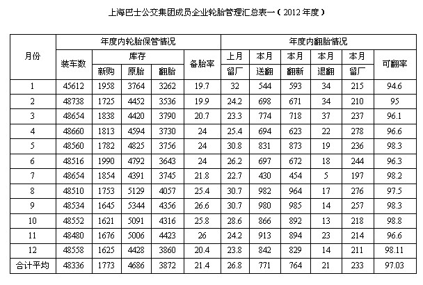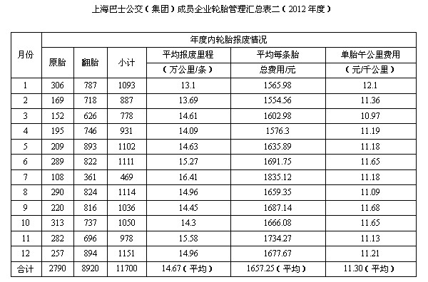 按照2012年新胎購置成本,40.2萬元可購243條輪胎。報表以充分說明上海公交對節約輪胎資源,所采取的措施、方法是相當有成效的,有效履行企業對節約資源、_創建低碳社會的責任。